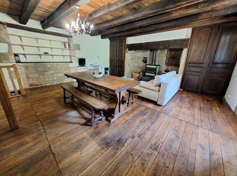 Sur la commune de Sousceyrac en Quercy, dans un hameau, maison de caractère de type 3, élevée sur cave, composée d’une cuisine ouverte sur le séjour-salle à manger avec cheminée et souillarde, et d’une salle d’eau; à l’étage un grand dégagement et deux chambres. Terrain clôturé. Environnemenr calme.